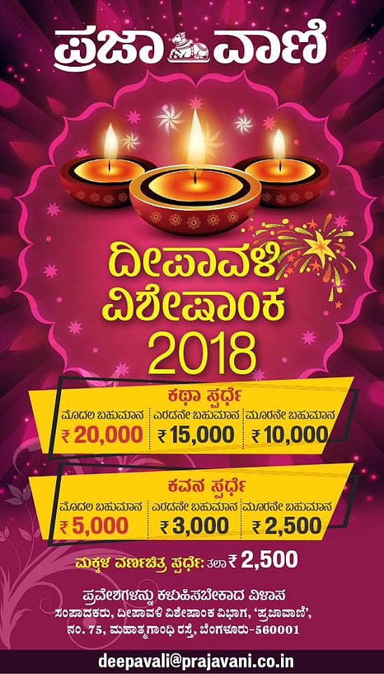 * ಪ್ರವೇಶಗಳನ್ನು ಕಳುಹಿಸಬೇಕಾದ ವಿಳಾಸ: ಸಂಪಾದಕರು, ದೀಪಾವಳಿ ವಿಶೇಷಾಂಕ ವಿಭಾಗ, ‘ಪ್ರಜಾವಾಣಿ’, ನಂ. 75, ಮಹಾತ್ಮಗಾಂಧಿ ರಸ್ತೆ, ಬೆಂಗಳೂರು–560001
