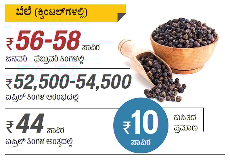 ನವೆಂಬರ್, ಡಿಸೆಂಬರ್ನಲ್ಲಿ ಪ್ರತಿ ಕ್ವಿಂಟಲ್ ಕಾಳು ಮೆಣಸಿಗೆ ₹ 60 ಸಾವಿರ ಬೆಲೆಯಿತ್ತು. ಆಗ ಮಾರಾಟ ಮಾಡಲು ಬೆಳೆ ಕೈಸೇರಿರಲಿಲ್ಲ. ಹೊಸಬೆಳೆ ಬಂದ ನಂತರ ಬೆಲೆಯೂ ಸ್ಥಿರವಾಗಿಲ್ಲ. ಜನವರಿ, ಫೆಬ್ರುವರಿಯಲ್ಲಿ ಕ್ವಿಂಟಲ್ಗೆ ₹ 56 ಸಾವಿರದಿಂದ ₹ 58 ಸಾವಿರದ ಆಸುಪಾಸಿನಲ್ಲಿತ್ತು. ಮಾರ್ಚ್ನಲ್ಲೂ ಅಂತಹ ಏರಿಳಿತ ಕಂಡಿರಲಿಲ್ಲ. ಆದರೆ, ಏಪ್ರಿಲ್ನಲ್ಲಿ ಇಂದಿದ್ದ ಬೆಲೆ ನಾಳೆಯಿಲ್ಲ ಎನ್ನುವ ಪರಿಸ್ಥಿತಿ ಎದುರಾಗಿದೆ.