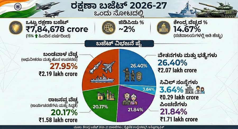 2026-27ನೇ ಸಾಲಿನ ಕೇಂದ್ರ ಬಜೆಟ್ ಭಾರತದ ರಕ್ಷಣಾ ಕ್ಷೇತ್ರಕ್ಕೆ ಭಾರೀ ಉತ್ತೇಜನ ನೀಡಿದ್ದು, 2026-27ರ ಅವಧಿಗೆ ದಾಖಲೆಯ 7,84,678 ಕೋಟಿ ರೂಪಾಯಿಗಳನ್ನು ನಿಯೋಜಿಸಿದೆ. ಇದು ಹಿಂದಿನ ವರ್ಷದ 6.81 ಲಕ್ಷ ಕೋಟಿ ರೂಪಾಯಿಗೆ ಹೋಲಿಸಿದರೆ 15% ಹೆಚ್ಚಳವಾಗಿದೆ. 2025ರಲ್ಲಿ ಭಾರತ ಆಪರೇಷನ್ ಸಿಂದೂರ ಕಾರ್ಯಾಚರಣೆ ನಡೆಸಿತ್ತು. ಭಾರತದ ಮೇಲಿನ ಭಯೋತ್ಪಾದಕ ದಾಳಿಗೆ ಪ್ರತಿಯಾಗಿ, ಮೇ ತಿಂಗಳಲ್ಲಿ ಪಾಕಿಸ್ತಾನ ಮತ್ತು ಪಾಕ್ ಆಕ್ರಮಿತ ಕಾಶ್ಮೀರಗಳಲ್ಲಿನ ಭಯೋತ್ಪಾದನಾ ಶಿಬಿರಗಳ ಮೇಲೆ ಭಾರತ ಪ್ರತಿ ದಾಳಿ ನಡೆಸಿತ್ತು. ಇದು ಭಾರತದ ನಿಖರ ದಾಳಿ ಸಾಮರ್ಥ್ಯ ಮತ್ತು ಗಡಿಯಾಚೆಗಿನ ಭಯೋತ್ಪಾದನೆಯ ವಿರುದ್ಧ ಭಾರತದ ನಿರ್ಣಾಯಕ ಪ್ರತಿಕ್ರಿಯೆಗೆ ಸಾಕ್ಷಿಯಾಗಿತ್ತು. ಈ ಯಶಸ್ವಿ ಕಾರ್ಯಾಚರಣೆಯ ಬೆನ್ನಲ್ಲೇ ಮಂಡನೆಯಾಗಿರುವ ಈ ವರ್ಷದ ಬಜೆಟ್, ಭಾರತೀಯ ಸೇನಾ ಪಡೆಗಳನ್ನು ಆಧುನಿಕ, ಸ್ವಾವಲಂಬಿ, ಮತ್ತು ಚೀನಾ ಹಾಗೂ ಪಾಕಿಸ್ತಾನಗಳಂತಹ ನೆರೆಯ ದೇಶಗಳ ಸವಾಲುಗಳನ್ನು ಎದುರಿಸಲು ಸಜ್ಜಾಗುವಂತೆ ಮಾಡುವ ಗುರಿ ಹೊಂದಿದೆ.