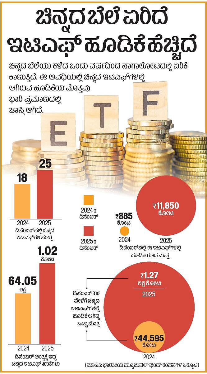 ಚಿನ್ನದ ಬೆಲೆಯು ಕಳೆದ ಒಂದು ವರ್ಷದಿಂದ ನಾಗಾಲೋಟದಲ್ಲಿ ಏರಿಕೆ ಕಾಣುತ್ತಿದೆ. ಈ ಅವಧಿಯಲ್ಲಿ ಚಿನ್ನದ ಇಟಿಎಫ್ಗಳಲ್ಲಿ ಆಗಿರುವ ಹೂಡಿಕೆಯ ಮೊತ್ತವು ಭಾರಿ ಪ್ರಮಾಣದಲ್ಲಿ ಜಾಸ್ತಿ ಆಗಿದೆ.