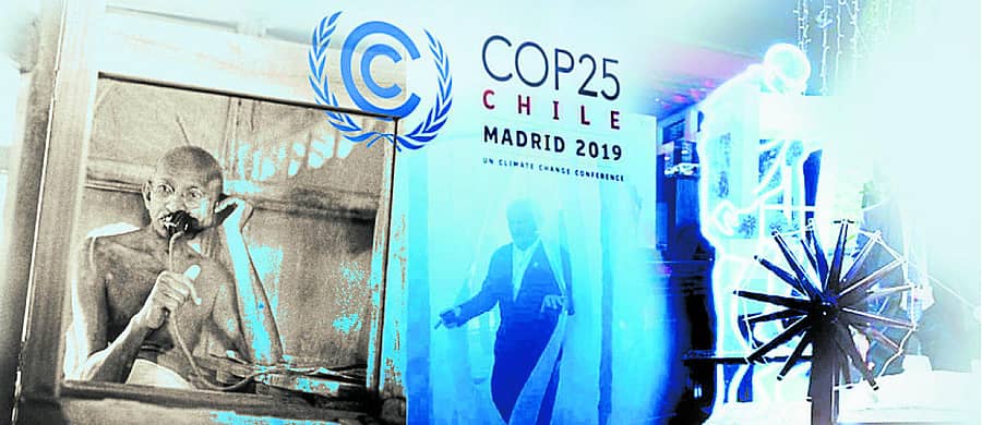 ಬರುತ್ತಿರುವ ಉರಿಯುಗವನ್ನು ಎದುರಿಸುವುದು ಹೇಗೆ ಎಂಬ ಬಗ್ಗೆ 25ನೇ ವಾರ್ಷಿಕ ಜಾಗತಿಕ ಕ್ಲೈಮೇಟ್ ಸಮಾವೇಶ ಸ್ಪೇನಿನ ರಾಜಧಾನಿ ಮಾಡ್ರಿಡ್ನಲ್ಲಿ ನಡೆಯುತ್ತಿದೆ. 177 ದೇಶಗಳ ವಿಜ್ಞಾನಿಗಳು, ರಾಜತಾಂತ್ರಿಕ ಪರಿಣತರು, ರಾಜಕೀಯ ಮುತ್ಸದ್ದಿಗಳ ಈ ಸಮಾವೇಶ ಡಿಸೆಂಬರ್ 2ರಂದು ಆರಂಭವಾಗಿದ್ದು ನಾಳೆಗೆ ಮುಕ್ತಾಯವಾಗಲಿದೆ. ಅಲ್ಲಿ ಸ್ಥಾಪಿಸಲಾದ ವಿವಿಧ ದೇಶಗಳ ಪ್ರದರ್ಶನ ಮಳಿಗೆಗಳಲ್ಲಿ ಭಾರತದ್ದೇ ಅತಿ ವಿಶಿಷ್ಟವಾಗಿದೆ. ಗಾಂಧೀಜಿಯವರ ಸಾಲು ಸಾಲು ಬಟ್ಟೆಚಿತ್ರಗಳನ್ನು ತೂಗುಹಾಕಿ, ನಡುವೆ ಗಾಂಧೀಜಿಯ ಸರಳ ಜೀವನದ ಸಂಕೇತಗಳನ್ನೂ ಕೂರಿಸಲಾಗಿದೆ. ವರ್ಧಾ ಆಶ್ರಮದ ದೃಶ್ಯವನ್ನೇ ಹೋಲುವ ಚರಕ, ಚಾಪೆ, ಚೊಂಬು, ದಿಂಬುಗಳನ್ನು ಇರಿಸಲಾಗಿದೆ. ಅದರ ಸಂದೇಶ ಸರಳವಾಗಿದೆ: ಬಿಸಿಪ್ರಳಯಕ್ಕೆ ಭಾರತೀಯರೇ ಅತಿದೊಡ್ಡ ಸಂಖ್ಯೆಯಲ್ಲಿ ಬಲಿಯಾಗಲಿದ್ದಾರೆ ಎಂದು ವಿಜ್ಞಾನಿಗಳು ಹೇಳುತ್ತಿದ್ದರೂ, ಈ ಪ್ರಳಯವನ್ನು ಯಶಸ್ವಿಯಾಗಿ ಎದುರಿಸುವುದು ಹೇಗೆಂಬ ಅತಿ ಯಶಸ್ವೀ ಉದಾಹರಣೆಗಳೂ ಭಾರತದಲ್ಲೇ ಸಿಗಲಿವೆ ಎನ್ನುವವರೂ ಇದ್ದಾರೆ. ಗಾಂಧೀಜಿ ತೋರಿದ ಸರಳ ಬದುಕಿನ ಮಾದರಿಯೇ ಬಿಸಿಯುಗದ ಸಮಸ್ಯೆಗಳಿಗೆ ಪರಿಹಾರ ಎಂಬ ಸಂದೇಶ ಅದು.
