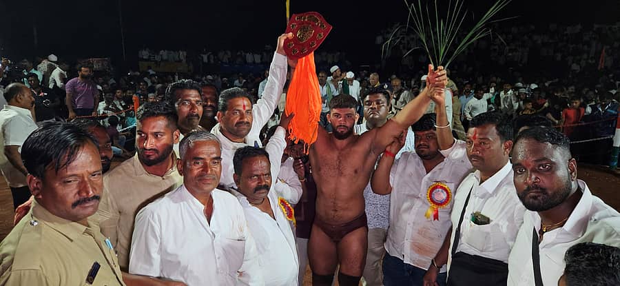 ಮಹಾಲಿಂಗಪುರ: ಪಟ್ಟಣದ ಮಹಾಲಿಂಗೇಶ್ವರ ಜಾತ್ರೆ ಅಂಗವಾಗಿ ನಾಲ್ಕನೇ ದಿನವಾದ ಸೋಮವಾರ ಹಮ್ಮಿಕೊಂಡ ರಾಷ್ಟ್ರಮಟ್ಟದ ಕುಸ್ತಿ ಪಂದ್ಯಾವಳಿಯಲ್ಲಿ ರಾಷ್ಟ್ರೀಯ ಚಾಂಪಿಯನ್, ಮಹಾರಾಷ್ಟ್ರದ ಪೈಲ್ವಾನ್ ಸಿಕಂದರ್ ಶೇಖ್ ಗೆಲುವಿನ ನಗೆ ಬೀರಿದರು.