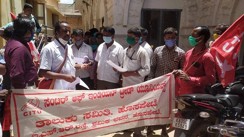 ಹೊಸಪೇಟೆ: ರಾಜ್ಯ ಸರ್ಕಾರ ಘೋಷಿಸಿರುವ ಸಹಾಯ ಧನ ತಕ್ಷಣವೇ ಬಿಡುಗಡೆ ಮಾಡಬೇಕೆಂದು ಆಗ್ರಹಿಸಿ ರಾಜ್ಯ ಕಟ್ಟಡ ಮತ್ತು ಇತರೆ ನಿರ್ಮಾಣ ಕಾರ್ಮಿಕರ ಫೆಡರೇಶನ್ ನೇತೃತ್ವದಲ್ಲಿ ಕಾರ್ಮಿಕರು ಶುಕ್ರವಾರ ಇಲ್ಲಿನ ಕಾರ್ಮಿಕ ಇಲಾಖೆಯ ಕಚೇರಿ ಎದುರು ಪ್ರತಿಭಟನೆ ನಡೆಸಿದರು.