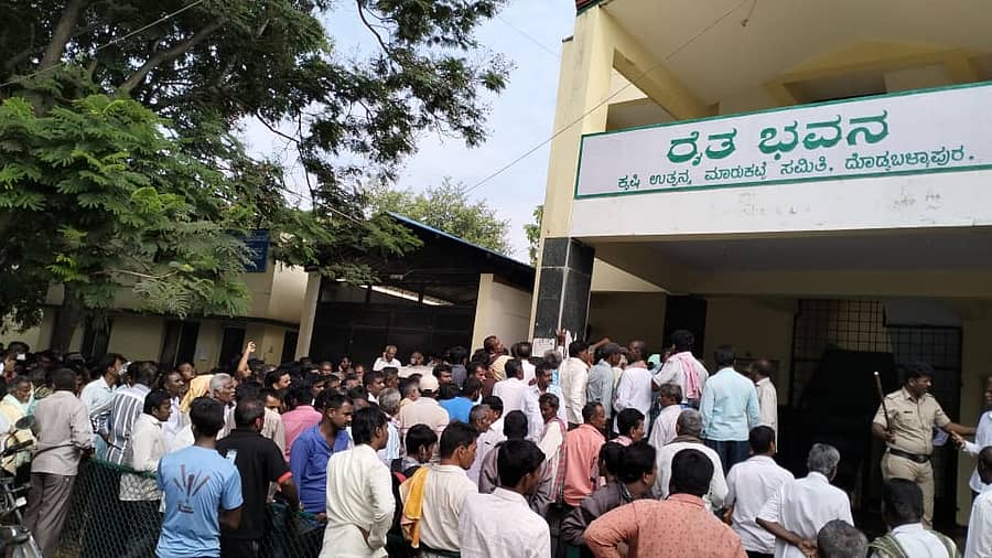 ದೊಡ್ಡಬಳ್ಳಾಪುರ: ನಗರದ ಎಪಿಎಂಸಿ ಆವರಣದ ರಾಗಿ ಖರೀದಿ ಕೇಂದ್ರದಲ್ಲಿ ನೋಂದಣಿ ಮಾಡಿಸಲು ರೈತರುನೂರಾರು ಸಂಖ್ಯೆಯಲ್ಲಿ ಸೇರಿದ್ದರಿಂದ ಬಾರಿ ನೂಕುನುಗ್ಗಲು ಉಂಟಾಗಿದೆ.