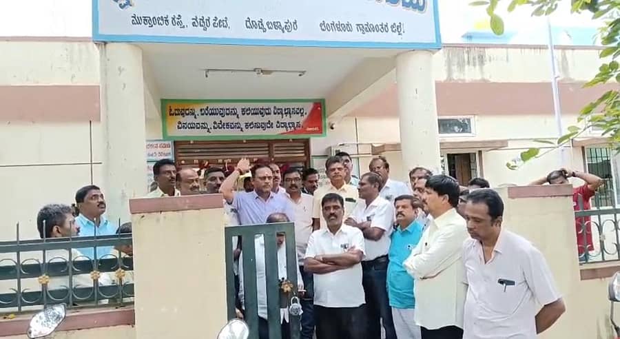 ದೊಡ್ಡಬಳ್ಳಾಪುರದಲ್ಲಿ ಸಾಮಾಜಿಕ- ಶೈಕ್ಷಣಿಕ ಸಮೀಕ್ಷೆಗೆ ಮನೆಗಳ ಹಂಚಿಕೆಯನ್ನು ಅವೈಜ್ಞಾನಿಕವಾಗಿ ಮಾಡಲಾಗಿದೆ ಎಂದು ಆರೋಪಿಸಿ ಶಿಕ್ಷಕರು ಕ್ಷೇತ್ರ ಶಿಕ್ಷಣಾಧಿಕಾರಿಗಳ ಕಚೇರಿ ಮುಂದೆ ಬುಧವಾರ ಪ್ರತಿಭಟಿಸಿದರು. ತಾಲ್ಲೂಕಿನಲ್ಲಿ ಇನ್ನು ಯಾರು ಸಹ ಸಮೀಕ್ಷೆ ಆರಂಭಿಸಿಲ್ಲ.