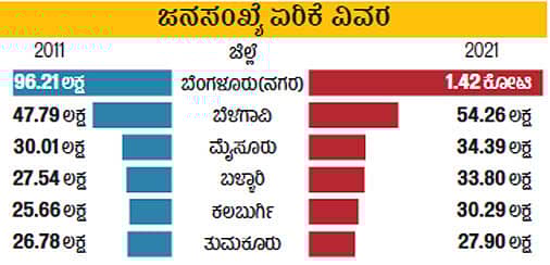 2011ರಲ್ಲಿ ಬೆಂಗಳೂರು ನಗರದಲ್ಲಿ 96.21 ಲಕ್ಷ ಜನಸಂಖ್ಯೆ ಇದ್ದರೆ, 2021ರ ವೇಳೆಗೆ ಈ ಸಂಖ್ಯೆ 1.42 ಕೋಟಿಗೆ ತಲುಪಲಿದೆ ಎಂದು ಆರ್ಥಿಕ ಹಾಗೂ ಅಂಕಿಸಂಖ್ಯೆ ಇಲಾಖೆಯ ನಿರ್ದೇಶನಾಲಯದ ವರದಿಯಲ್ಲಿ ಪ್ರಸ್ತಾಪಿಸಲಾಗಿದೆ.