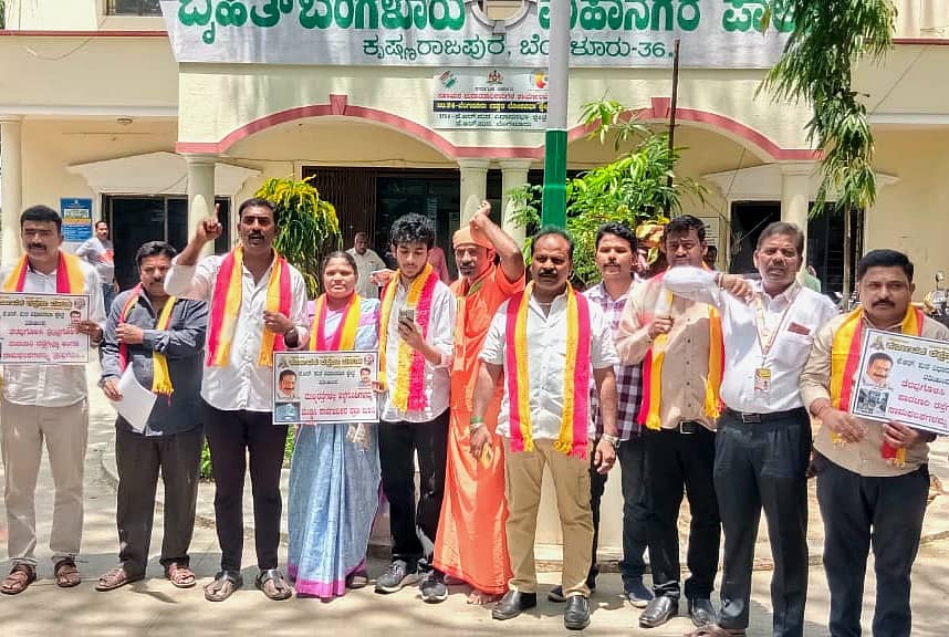 ಕೆ.ಆರ್.ಪುರ: ಕ್ಷೇತ್ರ ವ್ಯಾಪ್ತಿಯಲ್ಲಿರುವ ರಸ್ತೆ ಗುಂಡಿಗಳನ್ನು ಮುಚ್ಚುವಂತೆ ಆಗ್ರಹಿಸಿ ಕರ್ನಾಟಕ ರಕ್ಷಣಾ ವೇದಿಕೆ ಪ್ರವೀಣ್ ಕುಮಾರ್ ಶೆಟ್ಟಿ ಬಣದ ಕಾರ್ಯಕರ್ತರು ಕೆ.ಆರ್ ಪುರದ ಬಿಬಿಎಂಪಿ ಕಚೇರಿ ಮುಂದೆ ಪ್ರತಿಭಟನೆ ನಡೆಸಿದರು.
