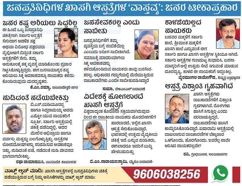 ಖಾಸಗಿ ಆಸ್ಪತ್ರೆಗಳು ರಾಜಕಾರಣಿಗಳಿಗೆ ವಿಶ್ರಾಂತಿ ಗೃಹಗಳಾಗಿವೆ. ರೋಗಿಗಳು ಹಾಸಿಗೆ ಸಿಗುತ್ತಿಲ್ಲ ಎಂದು ಪರದಾಡುತ್ತಿದ್ದರೆ, ರಾಜಕಾರಣಿಗಳು ಹಾಸಿಗೆ ಕಾಯ್ದಿರಿಸಿಕೊಂಡಿದ್ದಾರೆ. ಐಷಾರಾಮಿ ಆಸ್ಪತ್ರೆಯಲ್ಲಿ ದಾಖಲಾಗುವ ರಾಜಕಾರಣಿಗಳ ಲೆಕ್ಕಾಚಾರ ಒಳಗೊಂದು, ಹೊರಗೊಂದು. ಇವರೆಲ್ಲ ನಾವೇ ಆರಿಸಿದ ನಾಯಕರಲ್ಲವೇ?