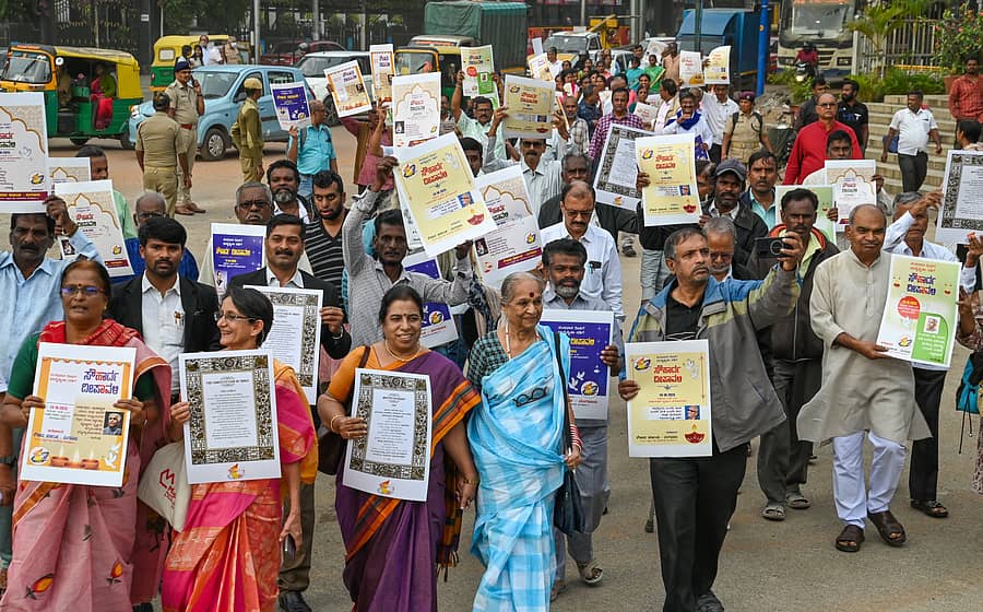 ಇದಕ್ಕೂ ಮುನ್ನ ಸಾಹಿತಿಗಳು, ಲೇಖಕರು, ಪ್ರಗತಿಪರ ಚಿಂತಕರು, ಹೋರಾಟಗಾರರು ಕಾರ್ಪೊರೇಷನ್ ವೃತ್ತದಿಂದ ಪುರಭವನದವರೆಗೆ ಫಲಕಗಳನ್ನು ಹಿಡಿದು ಮೆರವಣಿಗೆ ನಡೆಸಿದರು.