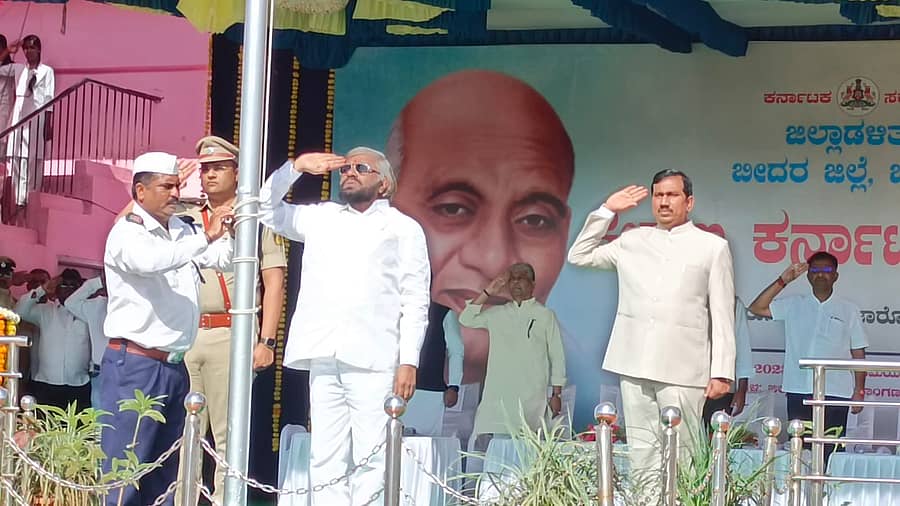 ಬೀದರ್: ಕಲ್ಯಾಣ ಕರ್ನಾಟಕದ ಉತ್ಸವದ ಅಂಗವಾಗಿ ನಗರದ ಜಿಲ್ಲಾ ನೆಹರೂ ಕ್ರೀಡಾಂಗಣದಲ್ಲಿ ಜಿಲ್ಲಾ ಉಸ್ತುವಾರಿ ಸಚಿವ ಈಶ್ವರ ಬಿ.ಖಂಡ್ರೆ ಅವರು ರಾಷ್ಟ್ರ ಧ್ವಜಾರೋಹಣ ಮಾಡಿದರು.
