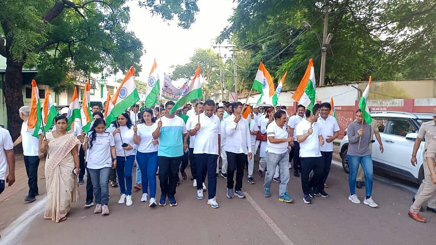 ಬೀದರ್: ಸ್ವಾತಂತ್ರ್ಯ ದಿನಾಚರಣೆ ಅಂಗವಾಗಿ ಜಿಲ್ಲಾಡಳಿತದಿಂದ ನಗರದಲ್ಲಿ ಬುಧವಾರ ಬೆಳಿಗ್ಗೆ ಏರ್ಪಡಿಸಿದ್ದ ಹರ್ ಘರ್ ತಿರಂಗಾ ಯಾತ್ರೆಯಲ್ಲಿ ನೂರಾರು ಜನ ಉತ್ಸಾಹದಿಂದ ಹೆಜ್ಜೆ ಹಾಕಿದರು..