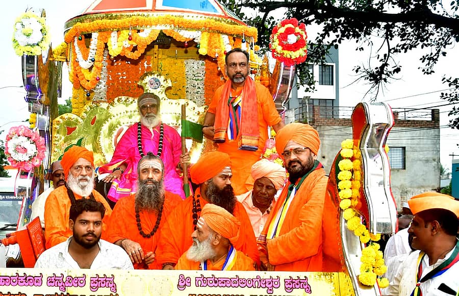 ರಾಷ್ಟ್ರೀಯ ಹೆದ್ದಾರಿಯಲ್ಲಿ ಅವರನ್ನು ಸ್ವಾಗತಿಸಿ ಮುಖ್ಯ ರಸ್ತೆಯ ಮೂಲಕ ಅಕ್ಕ ಮಹಾದೇವಿ ಕಾಲೇಜು ಆವರಣದಲ್ಲಿನ ಮಂಟಪಕ್ಕೆ ಕರೆತರಲಾಯಿತು. ವಾದ್ಯ ಮೇಳದವರು ಪಾಲ್ಗೊಂಡಿದ್ದರು. ಮಹಿಳೆಯರು ಕುಂಭ ಕಲಶ ಹೊತ್ತಿದ್ದರು. ಯುವಕರು ಹರ್ಷದಿಂದ ಕುಣಿದರು.