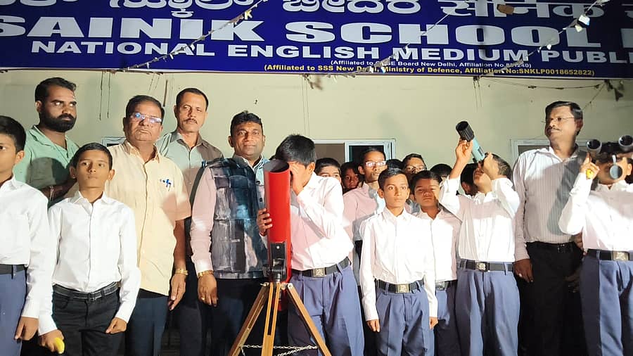 ಬೀದರ್: ಹೈದರಾಬಾದ್ ಕರ್ನಾಟಕ ಎಜ್ಯುಕೇಶನ್ ಸೊಸೈಟಿಯ ಬೀದರ್ ನ ಸೈನಿಕ್ ಶಾಲೆ ಹಾಗೂ ಜಿಲ್ಲಾ ವಿಜ್ಞಾನ ಸಮಿತಿ ಸಹಯೋಗದಲ್ಲಿ ನಗರದ ಬಿ.ವಿ.ಭೂಮರಡ್ಡಿ ಕಾಲೇಜು ಆವರಣದಲ್ಲಿ ಭಾನುವಾರ ರಾತ್ರಿ ಖಗ್ರಾಸ ಚಂದ್ರಗ್ರಹಣ ವೀಕ್ಷಣೆಗೆ ವ್ಯವಸ್ಥೆ ಮಾಡಲಾಗಿತ್ತು. ಬಾಹ್ಯಾಕಾಶದಲ್ಲಿ ನಡೆದ ವಿಸ್ಮಯವನ್ನು ಸೈನಿಕ ಶಾಲೆಯ ನೂರಾರು ವಿದ್ಯಾರ್ಥಿ, ಸಿಬ್ಬಂದಿ ಹಾಗೂ ಸಾರ್ವಜನಿಕರು ಕಣ್ತುಂಬಿಕೊಂಡರು.