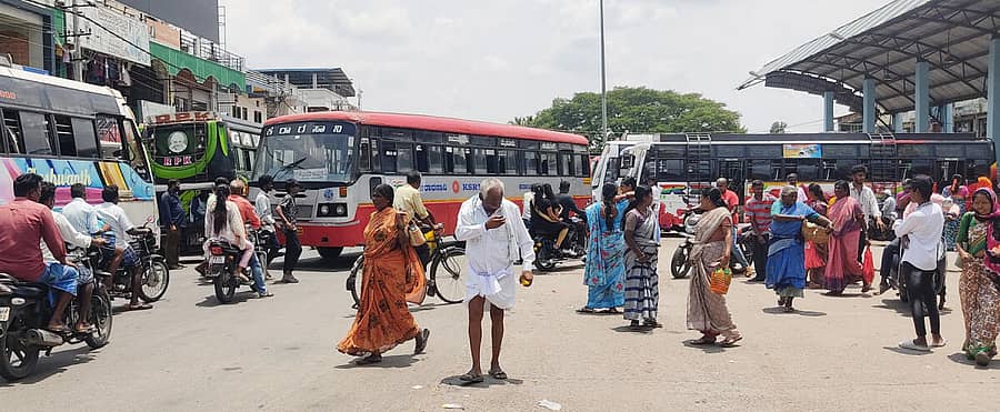 ‘ಬಸ್ ನಿಲ್ದಾಣ ಬಳಿ ಪೊಲೀಸ್ ಚೌಕಿ ಇದೆ. ಇದು ಹೆಸರಿಗಷ್ಟೇ ಇದೆ. ಇಲ್ಲಿ ಯಾರು ಇರುವುದಿಲ್ಲ. ಸಮೀಪದಲ್ಲಿ ನೂರಾರು ಆಟೊ ಮತ್ತು ದ್ವಿಚಕ್ರ ವಾಹನ ಅಡ್ಡಾದಿಡ್ಡಿ ನಿಲ್ಲುತ್ತವೆ. ಜನ ಸಂಚಾರಕ್ಕೆ ಇರುವ ಹಾದಿಗಳು ಒತ್ತುವರಿಯಾಗಿವೆ. ಹೋಟೆಲ್, ಅಂಗಡಿ, ಸಿಹಿತಿಂಡಿ ಮಾರಾಟ ಕೇಂದ್ರಗಳಾಗಿವೆ. ಇದರಿಂದ ಜನರು ಸಂಚರಿಸಲು ನಿತ್ಯ ನರಕ ಅನುಭವಿಸಬೇಕಿದೆ’ ಎಂದು ಮುಖಂಡ ಮಹೇಶ್ ದೂರಿದರು.
