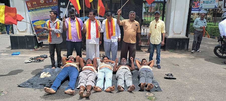ಜಿಲ್ಲಾಡಳಿತ ಭವನದ ಗೇಟ್ ಮುಂಭಾಗದಲ್ಲಿ ಪ್ರತಿಭಟನಕಾರರು ಅರೆಬೆತ್ತಲೆಯಾಗಿ ಅಂಗಾತ ಮಲಗಿ, ಹೊಟ್ಟೆಗೆ ತಣ್ಣೀರು ಬಟ್ಟೆ ಹಾಕಿಕೊಂಡು ತಮಿಳುನಾಡು, ಕರ್ನಾಟಕ ಸರ್ಕಾರ ಮತ್ತು ಕಾವೇರಿ ನೀರು ನಿರ್ವಹಣಾ ಪ್ರಾಧಿಕಾರದ ವಿರುದ್ದ ಘೋಷಣೆ ಕೂಗಿದರು.