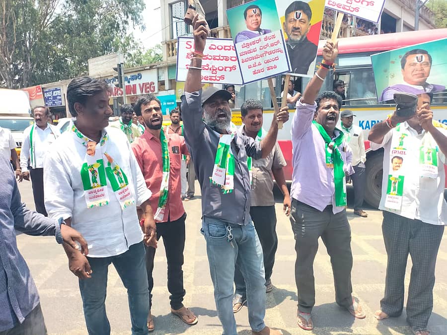 ಎಸ್ಐಟಿ ಎಂದರೆ ಶಿವಕುಮಾರ್ ಇನ್ವೆಸ್ಟಿಗೇಷನ್ ಟೀಮ್ ಎಂದು ಡಿಕೆಶಿ ವಿರುದ್ಧ ಘೋಷಣೆ ಕೂಗಿದರು. ಡಿ.ಕೆ.ಶಿವಕುಮಾರ್ ಮತ್ತು ಮಾಜಿ ಸಂಸದ ಎಲ್.ಆರ್.ಶಿವರಾಮೇಗೌಡ ಭಾವಚಿತ್ರಕ್ಕೆ ಚಪ್ಪಲಿ ಏಟು ಹಾಕಿದರು.