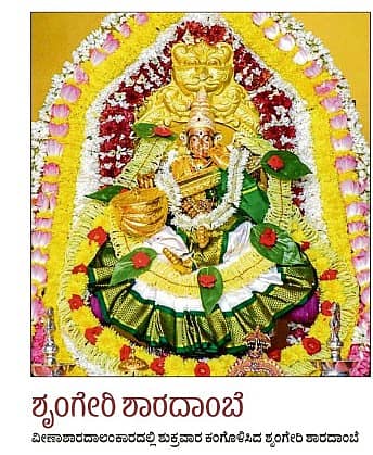ಶೃಂಗೇರಿ: ಶರನ್ನವರಾತ್ರಿಯ 8ನೇ ದಿನವಾದ ಬುಧವಾರ ಇಲ್ಲಿನ ಶಾರದಾ ಮಠದಲ್ಲಿ ಶಾರದಾ ದೇವಿಗೆ ಜ್ಞಾನಮುದ್ರೆ, ಅಮೃತಕಳಶ ಮತ್ತು ಪುಸ್ತಕಗಳನ್ನು ಕೈಗಳಲ್ಲಿ ಧರಿಸಿ, ವೀಣೆಯನ್ನು ಹಿಡಿದುಕೊಂಡಿರುವ ವೀಣಾಶಾರದಾಲಂಕಾರ ಮಾಡಲಾಗಿತ್ತು.