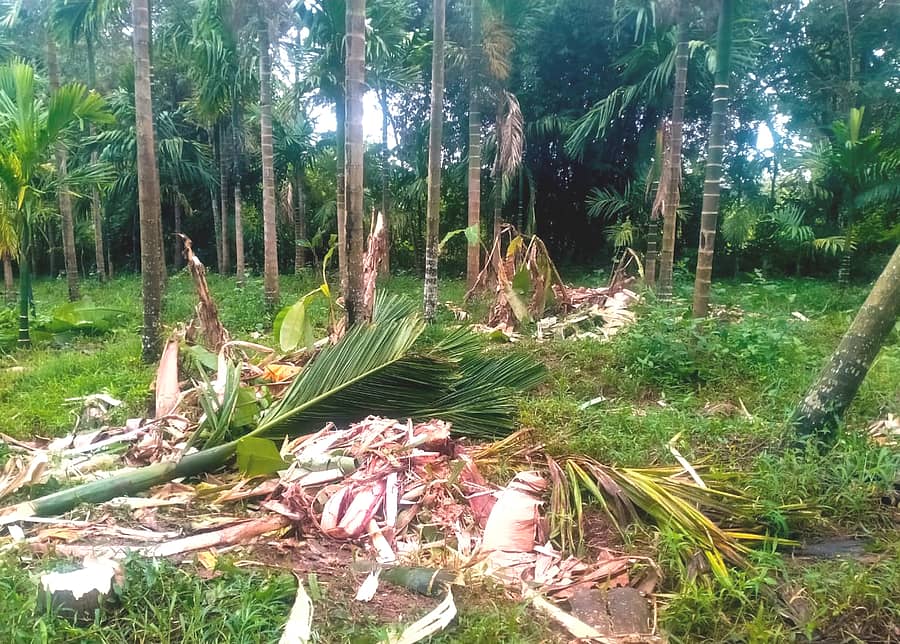 ಚಿನ್ನಕೂಡಿಗೆ ಗ್ರಾಮದ ಯಶೋದಮ್ಮ ಎಂಬುವರ ತೋಟಕ್ಕೆ ನುಗ್ಗಿದ ಕಾಡಾನೆ ಫಸಲು ಬಿಡುತ್ತಿದ್ದ 15 ವರ್ಷದ 40 ಅಡಿಕೆ ಮರಗಳನ್ನು ಧರೆಗುರುಳಿಸಿ, ಬಾಳೆ ಬೆಳೆಯನ್ನು ನಾಶ ಮಾಡಿದೆ.