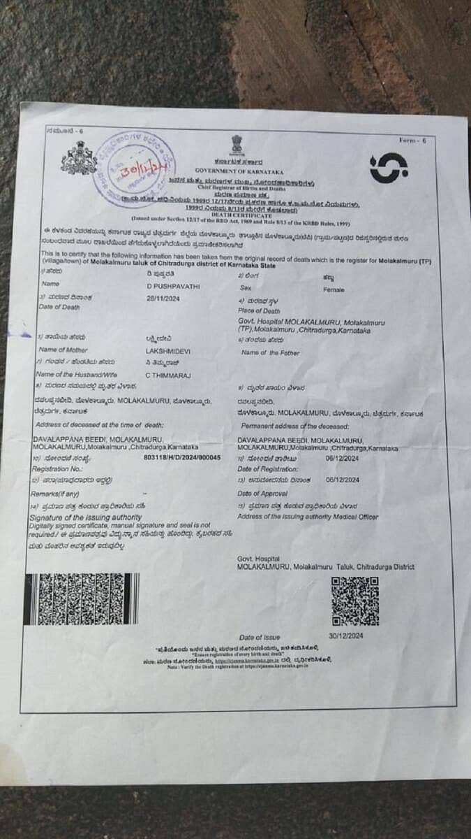 ಘಟನೆ ವಿವರ: ಪಟ್ಟಣದ ದವಳಪ್ಪನ ಬೀದಿ ಬಡಾವಣೆಯ ಸಿ. ತಿಮ್ಮರಾಜು ಎಂಬವರು 2024ರ ನ. 28ರಂದು ಅನಾರೋಗ್ಯದಿಂದ ಸ್ಥಳೀಯ ತಾಲ್ಲೂಕು ಆಸ್ಪತ್ರೆಯಲ್ಲಿ ಮೃತಪಟ್ಟಿದ್ದರು. ಒಂದು ತಿಂಗಳ ನಂತರ ಪತ್ನಿ ಡಿ.ಪುಷ್ಪಾವತಿ ಅವರು ಪತಿಯ ಮರಣ ಪ್ರಮಾಣಪತ್ರಕ್ಕಾಗಿ ಅರ್ಜಿ ಸಲ್ಲಿಸಿದ್ದರು. ಆಗ ನೀಡಿದ್ದ ಪ್ರಮಾಣಪತ್ರದಲ್ಲಿ ತಿಮ್ಮರಾಜು ಅವರ ತಾಯಿಯ ಹೆಸರು ತಪ್ಪಾಗಿ ನಮೂದಾಗಿತ್ತು. ಮತ್ತೆ ಪುಷ್ಪವತಿ ಹೊಸದಾಗಿ ಅರ್ಜಿ ಸಲ್ಲಿಸಿದ್ದರು.