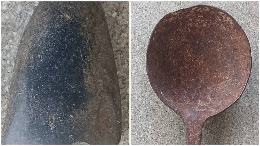 ಚಳ್ಳಕೆರೆ: ತಾಲ್ಲೂಕಿನ ದೊಡ್ಡೇರಿ ಗ್ರಾಮದ ನಿವೃತ್ತ ಉಪನ್ಯಾಸಕ ಡಿ.ಎಸ್. ರಾಜಣ್ಣರ ಅವರ ಜಮೀನಿನಲ್ಲಿ ಪಾಳೇಗಾರರ ಕಾಲದ ಕಬ್ಬಿಣದ ಸೌಟು ಹಾಗೂ ನೂತನ ಶಿಲಾಯುಧ (ಕಲ್ಲಿನ ಕೊಡಲಿ) ದೊರೆತಿವೆ ಎಂದು ಇತಿಹಾಸ ಸಂಶೋಧಕ ಮಹೇಶ್ ಕುಂಚಿಗನಾಳು ತಿಳಿಸಿದರು.