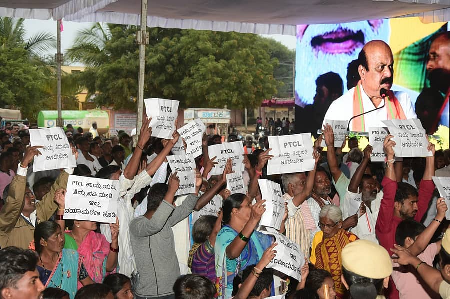 ಮುಖ್ಯಮಂತ್ರಿ ಬಸವರಾಜ ಬೊಮ್ಮಾಯಿ ಮಾತು ಆರಂಭಿಸುತ್ತಿದ್ದಂತೆ ವೇದಿಕೆಯ ಬಲಭಾಗದಲ್ಲಿದ್ದ 30ಕ್ಕೂ ಹೆಚ್ಚು ಪ್ರತಿಭಟನಕಾರರು ಭಿತ್ತಿ ಪತ್ರಗಳನ್ನು ಪ್ರದರ್ಶಿಸಿ ಘೋಷಣೆ ಕೂಗಿದರು. ಮುಜುಗರಕ್ಕೆ ಒಳಗಾದ ಬಿಜೆಪಿ ಮುಖಂಡರು ಸಮಾಧಾನಪಡಿಸಲು ಯತ್ನಿಸಿ ವಿಫಲರಾದರು. ಭಾಷಣ ಮುಗಿಸಿದ ಬಳಿಕ ಮುಖ್ಯಮಂತ್ರಿ ಪ್ರತಿಭಟನಕಾರರ ಬಳಿಗೆ ಧಾವಿಸಿ ಸಮಸ್ಯೆ ಆಲಿಸಿದರು.
