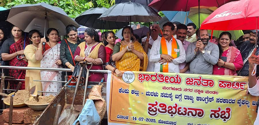 ಜಿಲ್ಲೆಯಲ್ಲಿ ಕೆಂಪು ಕಲ್ಲು ಮತ್ತು ಮರಳು ಸಮಸ್ಯೆ ಪರಿಹರಿಸಲು ರಾಜ್ಯ ಸರ್ಕಾರ ವಿಫಲವಾಗಿದೆ ಎಂದು ಆರೋಪಿಸಿ ಬಿಜೆಪಿ ದಕ್ಷಿಣ ಮಂಡಲ ಹಮ್ಮಿಕೊಂಡಿದ್ದ ಪ್ರತಿಭಟನೆಯಲ್ಲಿ ಅವರು ಮಾತನಾಡಿದರು.