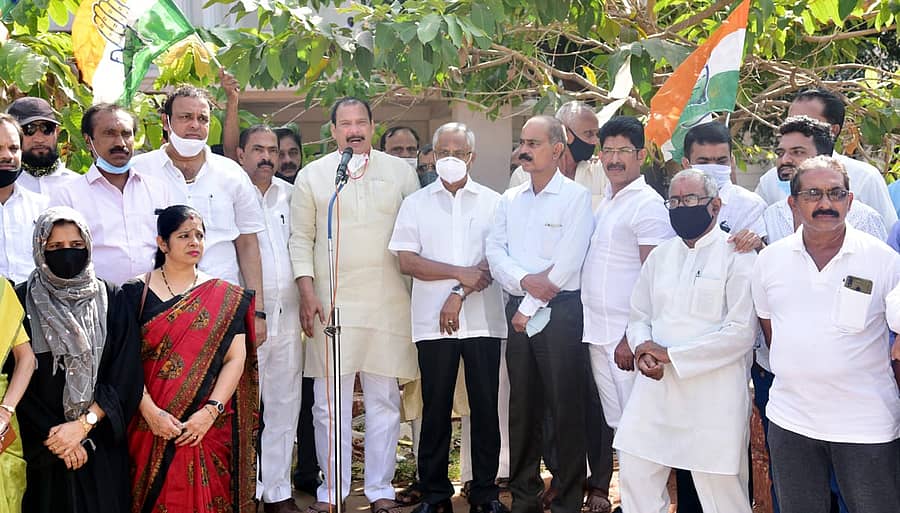 ಮಂಗಳೂರು: ಕೇಂದ್ರ ಸರ್ಕಾರ ರೈತ ವಿರೋಧಿ ಕಾಯ್ದೆಗಳನ್ನು ಕೈಬಿಡಬೇಕು ಎಂದು ಆಗ್ರಹಿಸಿ ದಕ್ಷಿಣ ಕನ್ನಡ ಜಿಲ್ಲಾ ಕಾಂಗ್ರೆಸ್ ಸಮಿತಿಯ ನೇತೃತ್ವದಲ್ಲಿ ನಗರದಲ್ಲಿ ಸೋಮವಾರ ಪ್ರತಿಭಟನೆ ನಡೆಯಿತು.