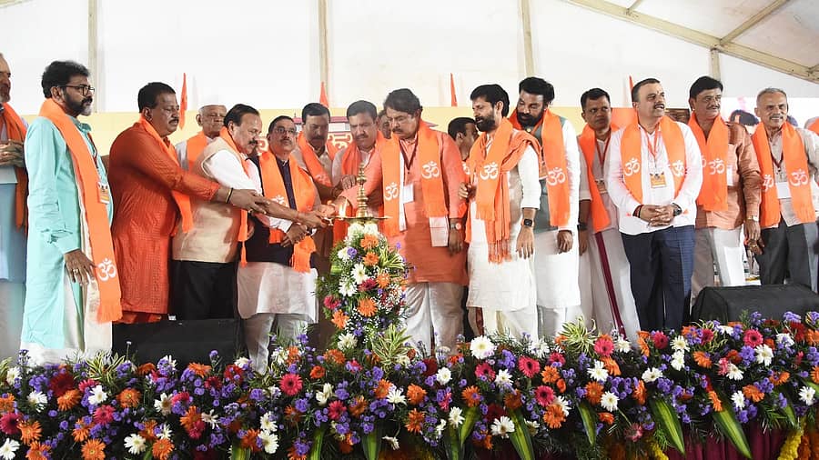 ಸಮಾವೇಶ ಉದ್ಘಾಟಿಸಿದ ಕೇಂದ್ರ ಸಚಿವ ಪ್ರಲ್ಹಾದ ಜೋಶಿ, 'ದೇಶದ ಬಹುಸಂಖ್ಯಾತರ ವಿರುದ್ಧ ಕಾಂಗ್ರೆಸ್ ಷಡ್ಯಂತ್ರ ಮಾಡುತ್ತಲೇ ಬಂದಿದೆ. ಅದರ ಮುಂದುವರಿದ ಭಾಗವೇ ಧರ್ಮಸ್ಥಳ ಪ್ರಕರಣ. ಶನಿಸಿಂಗ್ಣಾಪುರ, ಶಬರಿಮಲೆ ಶ್ರದ್ಧೆಗೆ ಭಂಗತರುವ ಯತ್ನ ನಡೆದ ಬಳಿಕ ದರ್ಮಸ್ಥಳದ ಹೆಸರು ಕೆಡಿಸುವ ಯತ್ನಕ್ಕೆ ಕೈಹಾಕಿದ್ದಾರೆ' ಎಂದು ಆರೋಪಿಸಿದರು.