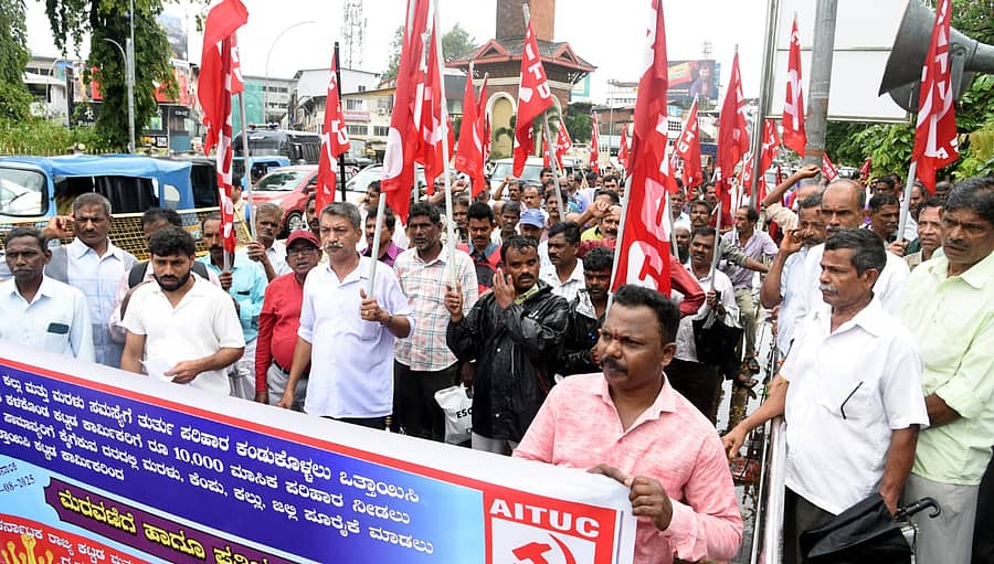 ಕರ್ನಾಟಕ ರಾಜ್ಯ ಕಟ್ಟಡ ಮತ್ತು ಇತರ ಕಾರ್ಮಿಕರ ಫೆಡರೇಷನ್ ದಕ್ಷಿಣ ಕನ್ನಡ ಜಿಲ್ಲಾ ಸಮಿತಿ ಆಯೋಜಿಸಿದ್ದ ಪ್ರತಿಭಟನೆ ಅಂಬೇಡ್ಕರ್ ವೃತ್ತದಿಂದ ಮೆರವಣಿಗೆ ಮೂಲಕ ಆರಂಭವಾಯಿತು.