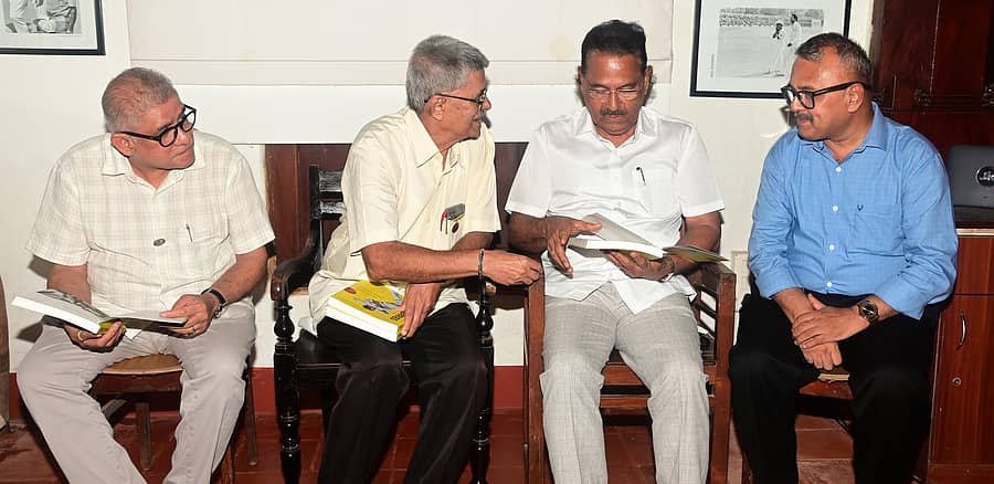 ‘ರೆಡ್ ಚೆರೀಸ್ ಆನ್ ದ ಕೆನರಾ ಕೋಸ್ಟ್; ಸ್ಟೋರಿ ಆಫ್ ಕ್ರಿಕೆಟ್ ಇನ್ ಮಂಗಳೂರು ಆ್ಯಂಡ್ ಉಡುಪಿ’ ಪುಸ್ತಕ ಬಿಡುಗಡೆ ಕಾರ್ಯಕ್ರಮದಲ್ಲಿ ಕಸ್ತೂರಿ ಬಾಲಕೃಷ್ಣ ಪೈ ಮತ್ತು ಕೃಷ್ಣ ಜೆ ಪಾಲೆಮಾರ್ ಮಾತುಕತೆಯಲ್ಲಿ ತೊಡಗಿದ್ದರು. ಪ್ರಶಾಂತ್ ಶೇಟ್ ಮತ್ತು ಜಯಂತ್ ಕೋಡ್ಕಣಿ ಪಾಲ್ಗೊಂಡಿದ್ದರು