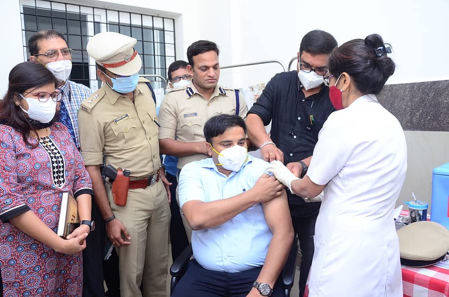 ಮಂಗಳೂರು: ಕೋವಿಡ್- 19 ನಿರೋಧಕ ಲಸಿಕೆಯನ್ನು ಸೋಮವಾರ ಬೆಳಿಗ್ಗೆ ನಗರದಲ್ಲಿನ ಜಿಲ್ಲಾ ಸರ್ಕಾರಿ ವೆನ್ಲಾಕ್ ಆಸ್ಪತ್ರೆಯ ಆಯುಷ್ ವಿಭಾಗದಲ್ಲಿ ಸ್ವತಃ ಹಾಕಿಸಿಕೊಳ್ಳುವುದರೊಂದಿಗೆ ಜಿಲ್ಲಾಧಿಕಾರಿ ಡಾ. ರಾಜೇಂದ್ರ ಕೆ.ವಿ ಅವರು ಎರಡನೇ ಸುತ್ತಿನ ಕೋವಿಡ್- 19 ನಿರೋಧಕಾ ಲಸಿಕೆ ಅಭಿಯಾನಕ್ಕೆ ಚಾಲನೆ ನೀಡಿದರು.