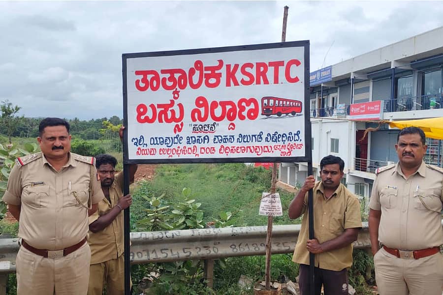‘ಪ್ರಯಾಣಿಕರಿಗೆ ಆಗುತ್ತಿರುವ ತೊಂದರೆಯನ್ನು ತಪ್ಪಿಸುವ ಸಲುವಾಗಿ ಡಿವೈಎಸ್ಪಿ ಸ್ಯಾಮ್ ವರ್ಗೀಸ್ ಅವರ ಮಾರ್ಗದರ್ಶನದಲ್ಲಿ ತಾತ್ಕಾಲಿಕ ಬಸ್ ನಿಲುಗಡೆ ವ್ಯವಸ್ಥೆ ಮಾಡಿದ್ದು, ಇಲ್ಲಿ ಯಾವುದೇ ಖಾಸಗಿ ವಾಹನಗಳ ನಿಲುಗಡೆಯನ್ನು ನಿಷೇಧಿಸಿದ್ದು, ಖಾಸಗಿ ವಾಹನ ನಿಲುಗಡೆ ಮಾಡಿದರೆ ದಂಡ ವಿಧಿಸಲಾಗುವುದು’ ಎಂದು ಪಿಐ ಕೆ.ಎನ್. ರವೀಶ್ ತಿಳಿಸಿದರು.