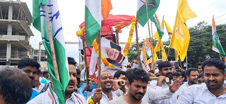 ದಾವಣಗೆರೆ: ಮೈಸೂರು ನಗರಾಭಿವೃದ್ಧಿ ಪ್ರಾಧಿಕಾರದಲ್ಲಿ (ಮುಡಾ) ಬದಲಿ ನಿವೇಶನ ಹಂಚಿಕೆ ಪ್ರಕರಣದಲ್ಲಿ ಮುಖ್ಯಮಂತ್ರಿ ಸಿದ್ದರಾಮಯ್ಯ ಅವರ ವಿರುದ್ಧ ತನಿಖೆಗೆ ಅನುಮತಿ ನೀಡಿದ ರಾಜ್ಯಪಾಲ ಥಾವರಚಂದ್ ಗೆಹಲೋತ್ ಅಣಕು ಶವಯಾತ್ರೆ ನಡೆಸಿ ಕಾಂಗ್ರೆಸ್ ಕಾರ್ಯಕರ್ತರು ಸೋಮವಾರ ಪ್ರತಿಭಟನೆ ನಡೆಸಿದರು.