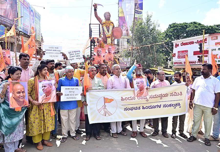 ಇಲ್ಲಿಯ ಸಂಗೊಳ್ಳಿ ರಾಯಣ್ಣ ವೃತ್ತದಲ್ಲಿ ಪ್ರತಿಭಟನೆ ನಡೆಸಿದ ಪ್ರತಿಭಟನಾಕಾರರು ರಾಜ್ಯ ಕಾಂಗ್ರೆಸ್ ಸರ್ಕಾರ ವಿರುದ್ಧ ಘೋಷಣೆ ಕೂಗಿದರು. ಹಿಂದೂ ಸಂತರಿಗೆ ಹಾಗೂ ಹಿಂದೂಗಳಿಗೆ ಅವಮಾನ ಮಾಡುವುದನ್ನು ನಿಲ್ಲಿಸಬೇಕು ಎಂದು ಬಿತ್ತಿ ಪತ್ರ ಹಿಡಿದು ಆಕ್ರೋಶ ವ್ಯಕ್ತಪಡಿಸಿದರು.