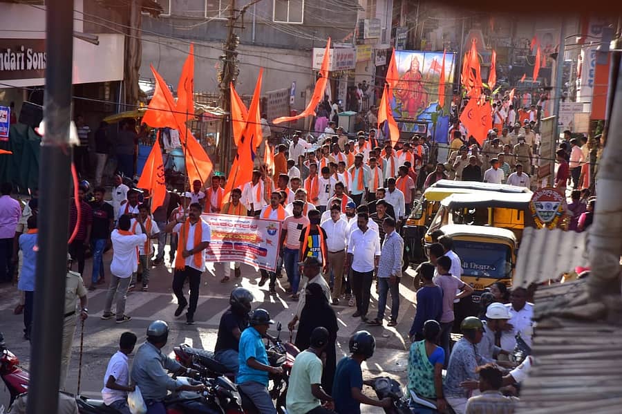 ಕೈಯಲ್ಲಿ ಭಗವಾಧ್ವಜ ಹಿಡಿದ ಕಾರ್ಯಕರ್ತರು, ಜೈ ಶ್ರೀರಾಮ್ ಎಂದು ಘೋಷಣೆ ಕೂಗುತ್ತಾ ಮೆರವಣಿಗೆಯಲ್ಲಿ ಹೆಜ್ಜೆ ಹಾಕಿದರು. ಭಾರತ ಮಾತೆಯ ಚಿತ್ರ ಹಾಗೂ ಆಂಜನೇಯ ಪ್ರತಿಮೆ ಗಮನ ಸೆಳೆಯಿತು.