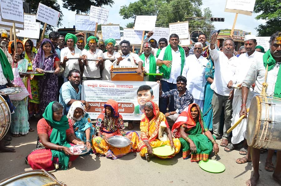 ರೈತರು ಡೊಳ್ಳು ಬಾರಿಸುತ್ತಾ, ಕೈಯಲ್ಲಿ ತಟ್ಟೆ ಹಿಡಿದು ನಗರದ ಪ್ರಮುಖ ಬೀದಿಗಳಲ್ಲಿ ಸಂಚರಿಸಿ, ದಾನಿಗಳಿಂದ ಹಣ, ಅಕ್ಕಿ, ತರಕಾರಿ ಮುಂತಾದ ವಸ್ತುಗಳನ್ನು ಬೇಡಿದರು. ಭಿಕ್ಷೆಯಿಂದ ಸಂಗ್ರಹಿಸಿದ ₹3,750 ಮೊತ್ತವನ್ನು ಜಿಲ್ಲಾಡಳಿತಕ್ಕೆ ತಲುಪಿಸಿ ‘ನಮಗೆ ಹಕ್ಕುಪತ್ರ ನೀಡಿ’ ಎಂದು ಒತ್ತಾಯಿಸಲು ಪ್ರತಿಭಟನಕಾರರು ಪ್ರಯತ್ನಿಸಿದರು. ಆದರೆ, ಅಧಿಕಾರಿಗಳು ಬಾರದ ಕಾರಣ ಧರಣಿ ಮುಂದುವರಿಸಿದರು.