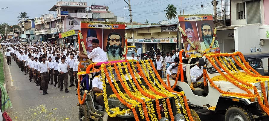 ರಾಣೆಬೆನ್ನೂರು: ರಾಷ್ಟ್ರೀಯ ಸ್ವಯಂ ಸೇವಕ ಸಂಘದ ಶತಮಾನೋತ್ಸವ ಅಂಗವಾಗಿ ನಗರದಲ್ಲಿ ಭಾನುವಾರ ಸಂಜೆ ರಾಷ್ಟ್ರೀಯ ಸ್ವಯಂಸೇವಕ ಸಂಘದ ಸಾವಿರಾರು ಗಣವೇಷಧಾರಿ ಸ್ವಯಂಸೇವಕರು ಮತ್ತು ಕಾರ್ಯಕರ್ತರಿಂದ ಪಥಸಂಚಲನ ನಡೆಯಿತು.