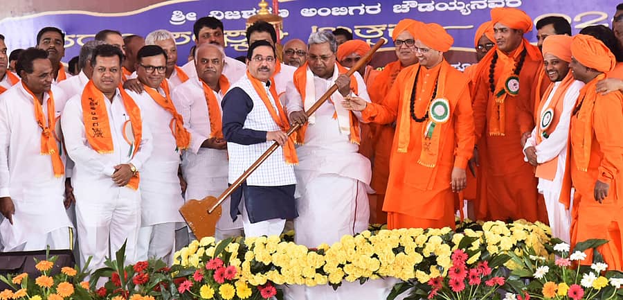 ‘ಈ ಸಮಾಜದ ಅಭಿವೃದ್ಧಿಗೆ ನಾನು ‘ಅಂಬಿಗರ ಚೌಡಯ್ಯ ನಿಗಮ’ ಸ್ಥಾಪಿಸಿದೆ. ಈ ಸಮಾಜಕ್ಕೆ ಆರ್ಥಿಕ ಶಕ್ತಿ ಬರಬೇಕು. ಆರ್ಥಿಕ, ಸಾಮಾಜಿಕ ಶಕ್ತಿಯಿಲ್ಲದ ಸಮಾಜ ಮುಖ್ಯವಾಹಿನಿಗೆ ಬರಲು ಸಾಧ್ಯವಾಗುವುದಿಲ್ಲ. ಸಮ ಸಮಾಜದ ಕನಸು ನನಸಾಗಲು ಆರ್ಥಿಕ ಸಮಾನತೆ ಬರಬೇಕು. ಸಮಾಜದ ಹಲವು ಬೇಡಿಕೆಗಳಿವೆ. ವಸತಿ ಶಾಲೆಗೆ ₹15 ಕೋಟಿ, ಮಠದ ಸಮಗ್ರ ಅಭಿವೃದ್ಧಿಗೆ ₹25 ಕೋಟಿ ಒಳಗೊಂಡಂತೆ ಎಲ್ಲಾ ಬೇಡಿಕೆಗಳನ್ನು ಈಡೇರಿಸಲು ಆಗದಿದ್ದರೂ ಹಲವು ಬೇಡಿಕೆಗಳನ್ನು ಖಂಡಿತ ಈಡೇರಿಸುವೆ’ ಎಂದರು. ರುದ್ರಾಕ್ಷಿ ಕಿರೀಟ: