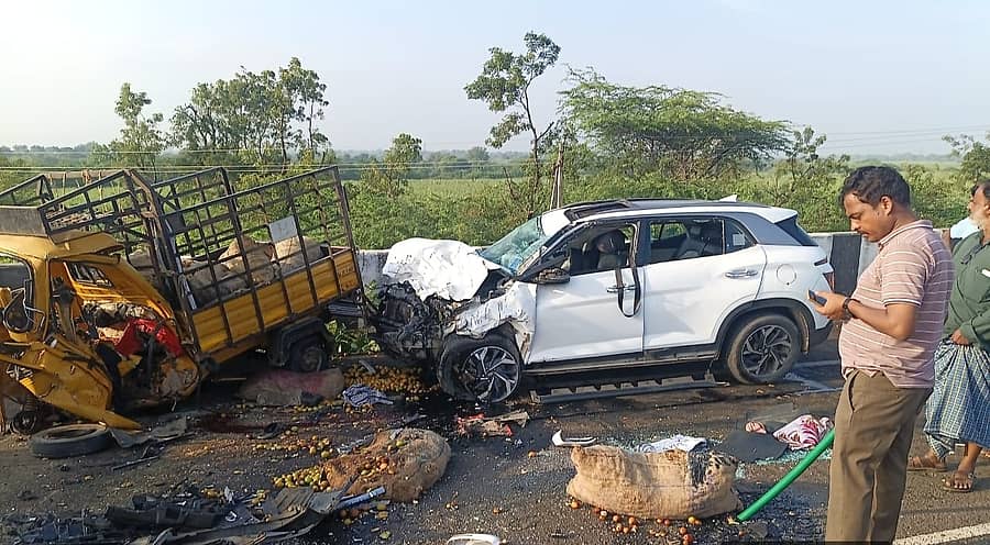 ‘ಜಾಲವಾದಿ ಗ್ರಾಮದಿಂದ ಬಾರೆಹಣ್ಣು ತುಂಬಿಕೊಂಡು ಕಲಬುರಗಿ ಕಡೆ ತೆರಳುತ್ತಿದ್ದ ಟಂಟಂ ವಾಹನವು, ಸಿಂದಗಿ ಕಡೆಗೆ ತೆರಳುತ್ತಿದ್ದ ಕಾರಿನ ನಡುವೆ ಡಿಕ್ಕಿಯಾಗಿದೆ. ಡಿಕ್ಕಿಯಾದ ರಭಸಕ್ಕೆ ಟಂಟಂನಲ್ಲಿದ್ದ ಇಬ್ಬರೂ ಮೃತಪಟ್ಟಿದ್ದಾರೆ’ ಎಂದು ಪೊಲೀಸರು ತಿಳಿಸಿದ್ದಾರೆ.