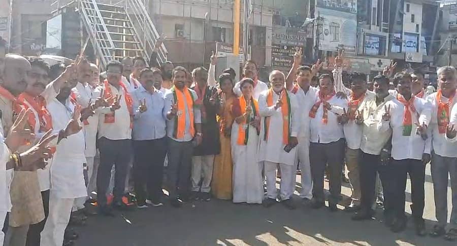 ನಗರದ ಸರ್ದಾರ್ ವಲ್ಲಭಭಾಯಿ ಪಟೇಲ್ ವೃತ್ತದಲ್ಲಿ ಸೇರಿದ ಬಿಜೆಪಿ ಮುಖಂಡರು, ಕಾರ್ಯಕರ್ತರು ಪಟಾಕಿ ಸಿಡಿಸಿ, ಪರಸ್ಪರ ಸಿಹಿ ಹಂಚಿ, ಘೋಷಣೆ ಕೂಗಿ ಸಂಭ್ರಮಿಸಿದರು.