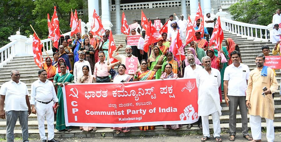 ಕಲಬುರಗಿ: ರಾಜ್ಯದ ಕಾಂಗ್ರೆಸ್ ಸರ್ಕಾರವನ್ನು ರಾಜ್ಯಪಾಲರು ಅಸ್ಥಿರಗೊಳಿಸುತ್ತಿದ್ದಾರೆ ಎಂದು ಆರೋಪಿಸಿ ಚುನಾವಣೆಯಲ್ಲಿ ಕಾಂಗ್ರೆಸ್ ಪಕ್ಷಕ್ಕೆ ಬೆಂಬಲ ನೀಡಿದ್ದ ಭಾರತ ಕಮ್ಯುನಿಸ್ಟ್ ಪಕ್ಷದ ಕಾರ್ಯಕರ್ತರು ಕಲಬುರಗಿಯಲ್ಲಿ ಗುರುವಾರ ಪ್ರತಿಭಟನೆ ನಡೆಸಿದರು.