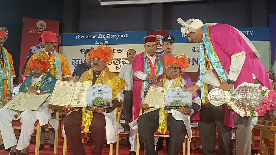 ಕಲಬುರಗಿ: ಗುಲಬರ್ಗಾ ವಿಶ್ವವಿದ್ಯಾಲಯದ 43ನೇ ವಾರ್ಷಿಕ ಘಟಿಕೋತ್ಸವದಲ್ಲಿ ಮಂಗಳವಾರ ಮೂವರು ಸಾಧಕರಿಗೆ ಗೌರವ ಡಾಕ್ಟರೇಟ್ ಪದವಿ ಪ್ರದಾನ ಮಾಡಲಾಯಿತು.
