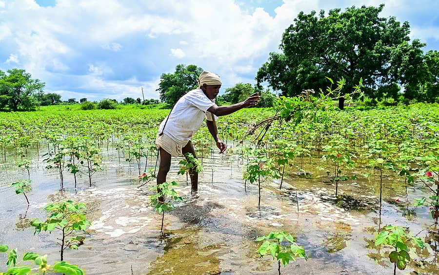ಜೇವರ್ಗಿ ತಾಲ್ಲೂಕಿನ ಕೋಳಕೂರ ಗ್ರಾಮದ ಮುಖ್ಯ ರಸ್ತೆಗೆ ಹೊಂದಿಕೊಂಡಂತಿರುವ ಜಮೀನಿನಲ್ಲಿ ಬೆಳೆದಿದ್ದ ಹತ್ತಿಯ ಮಧ್ಯದಲ್ಲಿ ಮೊಣಕಾಲ ತನಕ ನೀರು ತುಂಬಿ ನಿಂತಿದೆ. ಹತ್ತಿಯನ್ನು ಕೀಳದೇ ಈಗ ವಿಧಿಯೇ ಇಲ್ಲ. ಬೀಜ ಗೊಬ್ಬರಕ್ಕೆ ಹಾಕಿದ ಖರ್ಚು, ಆಳು ಹಚ್ಚಿ ಕಸ ಕೀಳಿಸಿದ್ದು ಸೇರಿದರೆ ಅದರ ಖರ್ಚು ಹತ್ತಾರು ಸಾವಿರ ದಾಟಲಿದೆ. ಅದನ್ನು ಸರಿದೂಗಿಸುವುದು ಹೇಗೆ ಎಂಬ ಚಿಂತೆಯಲ್ಲಿ ರೈತ ಬಾಬುರಾಯ ಆಡಿನ ಅವರು ಹೊಲದಲ್ಲಿ ನಿಂತಿದ್ದರು.