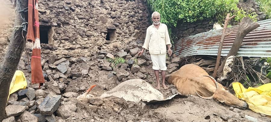 ಕೃಷಿ ಕೂಲಿಕಾರ್ಮಿಕ ಹನುಮಂತರಾಯ ಮಾದಪ್ಪ ಖೋಬ್ರೆ ಅವರು ಹೈನುಗಾರಿಕೆ ಉಪಜೀವನ ನಡೆಸುತ್ತಿದ್ದರು. ಸತತ ಮಳೆಯ ಕಾರಣದಿಂದ ಮನೆಯಲ್ಲಿನ ಕೊಟ್ಟಿಗೆಯಲ್ಲಿ ಎರಡು ಆಕಳು ಕಟ್ಟಿದರು. ದಿಢೀರನೆ ಮಳೆಗೆ ಗೋಡೆ ಮತ್ತು ಚಾವಣಿಯು ಕುಸಿದು ಕಟ್ಟಿದ ಆಕಳು ಮೇಲೆ ಬಿದ್ದ ಪರಿಣಾಮವಾಗಿ ಸ್ಥಳದಲ್ಲಿಯೇ ಮೃತಪಟ್ಟಿವೆ.