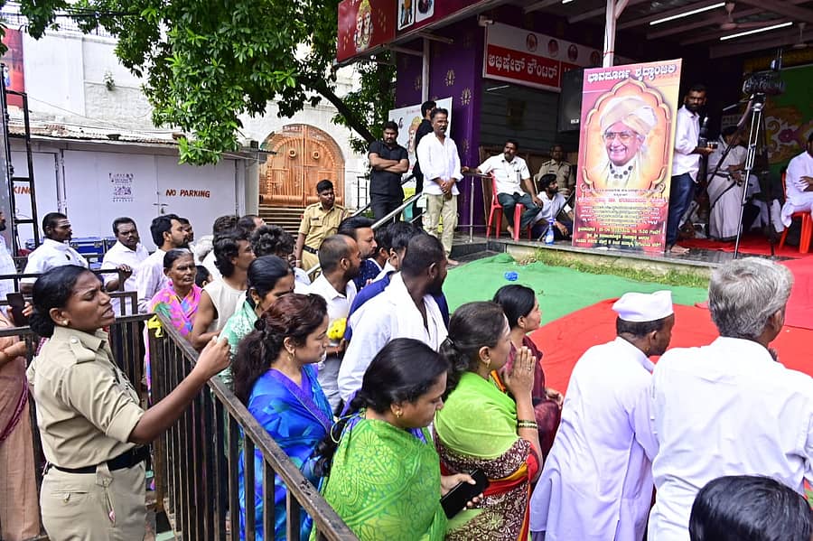 ಕಲಬುರಗಿಯ ಶರಣಬಸವೇಶ್ವರ ದೇವಸ್ಥಾನದ ಬಳಿ ಭಕ್ತರು ಶರಣಬಸವಪ್ಪ ಅಪ್ಪ ಅವರ ಅಂತಿಮ ದರ್ಶನಕ್ಕೆ ಭಜನೆ ಮಾಡುತ್ತಾ ಬಂದರು