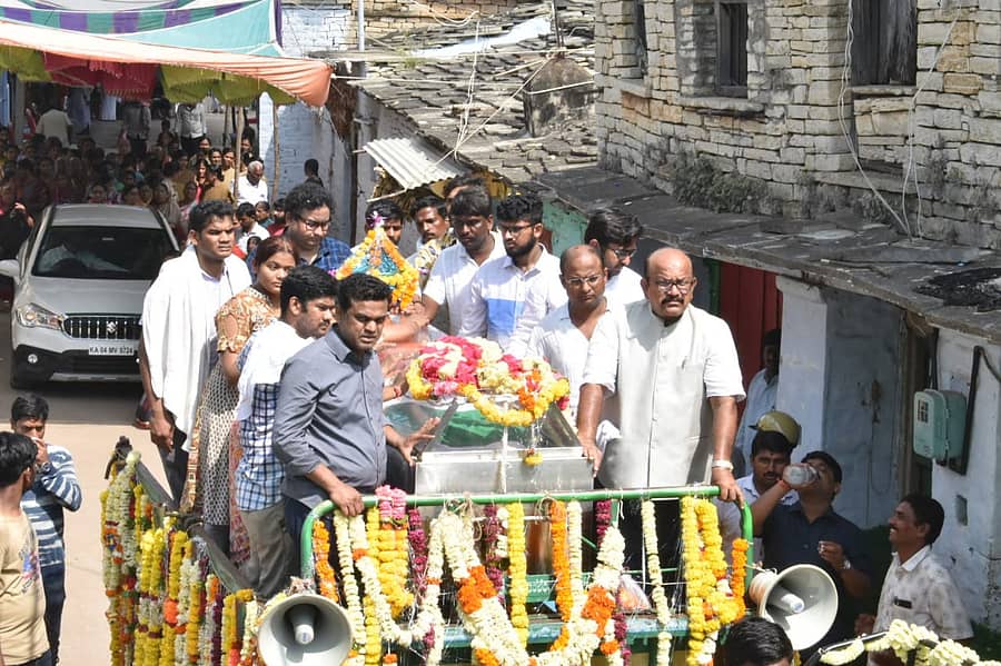 ಕಲಬುರ್ಗಿ: ಜಿಲ್ಲೆಯ ಚಿಂಚೋಳಿ ಪಟ್ಟಣದಲ್ಲಿರುವ ಮನೆಯಲ್ಲಿ ಧಾರ್ಮಿಕ ವಿಧಿ ವಿಧಾನ ಪೂರೈಸಿದ ಬಳಿಕ ಮಾಜಿ ಸಚಿವ ವೈಜನಾಥ ಪಾಟೀಲರ ಪಾರ್ಥಿವ ಶರೀರವನ್ನು ಮೆರವಣಿಗೆಯಲ್ಲಿಅಂತ್ಯಕ್ರಿಯೆ ಸ್ಥಳಕ್ಕೆ ಕರೆ ತರಲಾಗುತ್ತಿದೆ