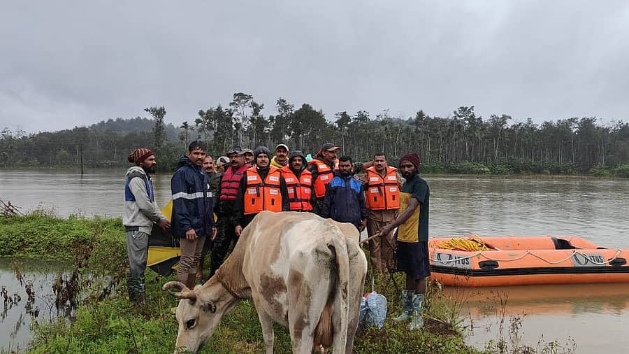 ಮಡಿಕೇರಿ: ಕೊಡಗಿನಲ್ಲಿ ಸುರಿಯುತ್ತಿರುವ ಧಾರಾಕಾರ ಮಳೆಯಿಂದ ವಿರಾಜಪೇಟೆ ತಾಲ್ಲೂಕಿನ ಕಾಕೊಟೊಪರಂಬು ಗ್ರಾಮದಲ್ಲಿ ಪ್ರವಾಹದ ನೀರಿನಲ್ಲಿ ಸಿಲುಕಿದ್ದ 6 ಮಂದಿಯನ್ನು ಜಿಲ್ಲಾ ತುರ್ತು ಸೇವೆಗಳು ಮತ್ತು ಅಗ್ನಿಶಾಮಕ ಪಡೆಯ ಸಿಬ್ಬಂದಿ ಬೋಟ್ ಮೂಲಕ ರಕ್ಷಿಸಿದ್ದಾರೆ.