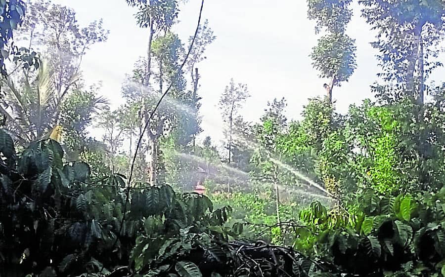 ನಾಪೋಕ್ಲು: ಕೊಯ್ಲು ಪೂರ್ಣಗೊಳ್ಳು ತ್ತಿದ್ದಂತೆ ಕಾಫಿ ತೋಟಗಳಿಗೆ ನೀರು ಹಾಯಿಸುವತ್ತ ಬೆಳೆಗಾರರು ಚಿತ್ತ ಹರಿಸಿದ್ದಾರೆ. ಕಾಫಿಗೆ ಉತ್ತಮ ಧಾರಣೆ ದೊರೆಯುತ್ತಿರುವುದರಿಂದ ಉತ್ತಮ ಸಹಜ ಇಳುವರಿ ಪಡೆಯಲು ಬೆಳೆಗಾರರು ಉತ್ಸುಕರಾಗಿದ್ದಾರೆ. ಸಕಾಲದಲ್ಲಿ ತೋಟಗಳಿಗೆ ನೀರು ಹಾಯಿಸಿದರೆ ಅಧಿಕ ಇಳುವರಿಯೂ ಲಭಿಸುವುದರಿಂದ ನೀರಿನ ಲಭ್ಯತೆ ಉಳ್ಳವರು ತುಂತುರು ನೀರಾವರಿ ಕೈಗೊಳ್ಳುತ್ತಿದ್ದಾರೆ.