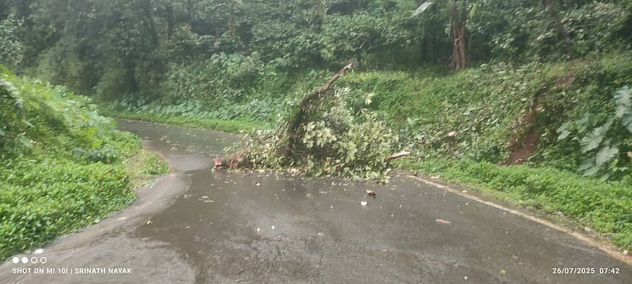 ಮಡಿಕೇರಿ -ಸೋಮವಾರಪೇಟೆ ಮಾರ್ಗದ ರಸ್ತೆಯ ಕಾಜೂರು ಬಳಿ ಮರವೊಂದು ರಸ್ತೆಗೆ ಉರುಳಿದೆ. ಭಾಗಮಂಡಲ- ತಲಕಾವೇರಿ ರಸ್ತೆಯಲ್ಲೂ ಮರ ಬಿದ್ದಿದೆ.