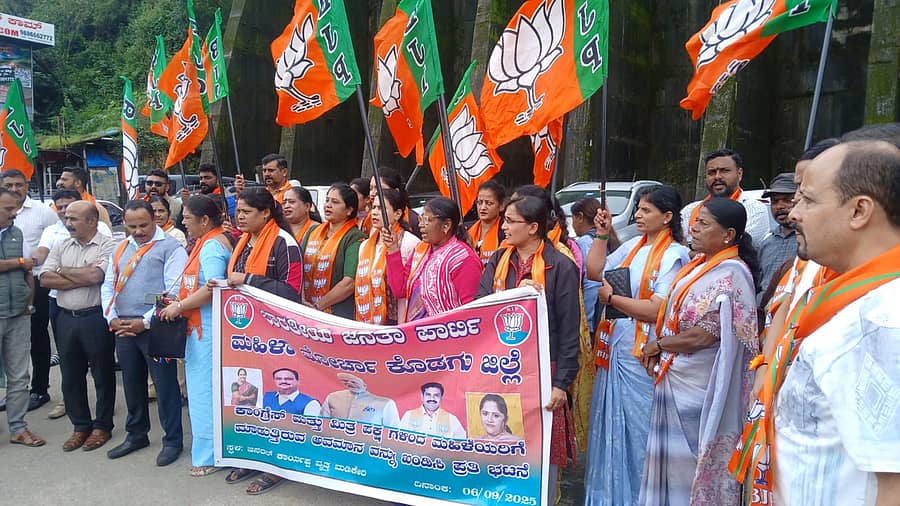 ಕೊಡಗು ಜಿಲ್ಲಾ ಬಿಜೆಪಿ ಮಹಿಳಾ ಮೋರ್ಚಾ ನೇತೃತ್ವದಲ್ಲಿ ಇಲ್ಲಿನ ಹಳೆಯ ಖಾಸಗಿ ಬಸ್ನಿಲ್ದಾಣದಲ್ಲಿ ಶನಿವಾರ ಕಾಂಗ್ರೆಸ್ ವಿರುದ್ಧ ಪ್ರತಿಭಟನೆ ನಡೆಯಿತು.